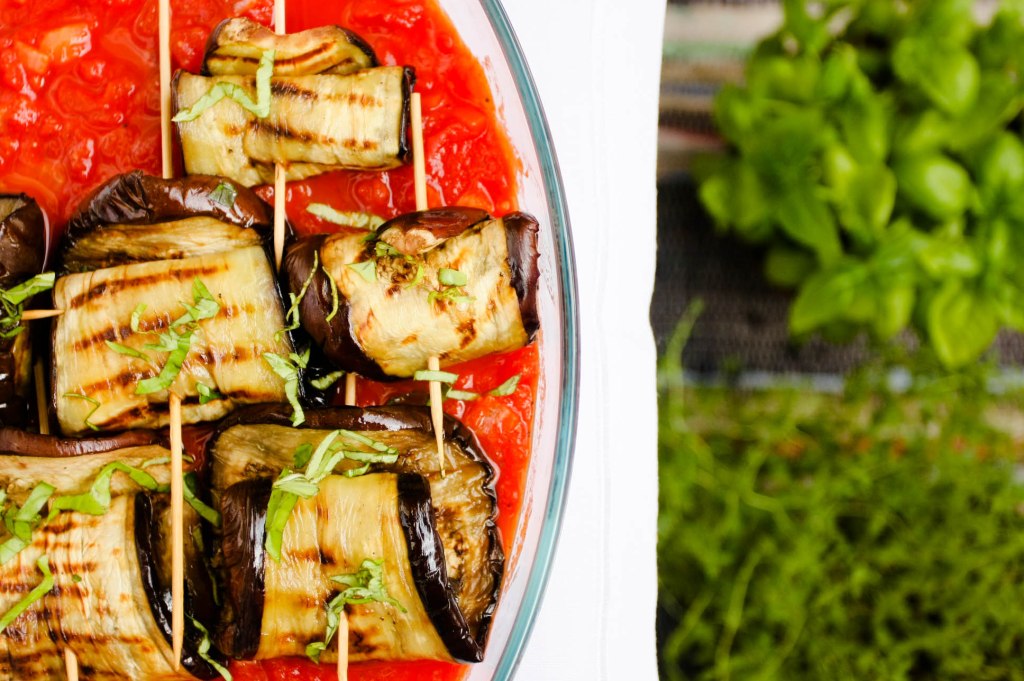 Rolady z grillowanych plastrów bakłażana z mozzarellą, zapiekane w sosie pomidorowym