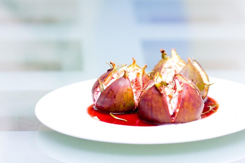Piekarnik nastawić na 180 stopni, figi naciąć w krzyż. Do środka, delikatnie dać kozi ser, listki rozmarynu i migdały. Zapiekać około 10-12 min. Po wyjęciu polać octem balsamicznym oraz winegretem. Gotowe.