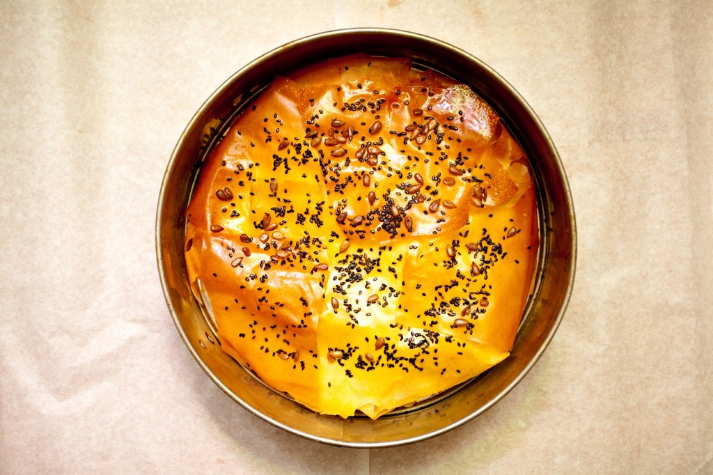 Szpinak płuczemy w wodzie, obcinamy łodygi – jeśli są – wrzucamy na patelnie z łyżką oliwy. Po dwóch, trzech chwilach zdejmujemy z ognia – właśnie wtedy, gdy liście są już lekko zwiędnięte. Kroimy, siekamy i odciskamy nadmiar soków. Pomidory tniemy na mniejsze kawałki, dodajemy resztę składników (oliwki, ser feta, gałka, słonecznik i jajko). Wszystko ładnie mieszamy w estetycznie wyglądający farsz. W formie do pieczenia tortów (tzw. „tortownica”) układamy niedbale maźnięte oliwą kawałki ciasta filo, tak aby tworzyły chaos jak obrona polskiej reprezentacji w piłce nożnej. Zostawiamy na koniec dwa arkusze ciasta. Do środka dajemy farsz, zawijamy ciasto i na wierzch dajemy pozostałe ciasto filo. Piekarnik na 180 stopni i 30 minut na sprzątanie bałaganu w kuchni. Smacznego.