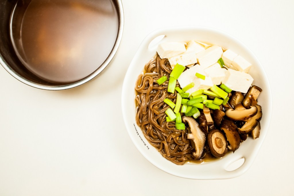 - Gotuję makaron wg przepisu na opakowaniu. Namoczone grzyby wyjmuję z wody i odsączam. Kroję tofu na mniejsze kawałki.