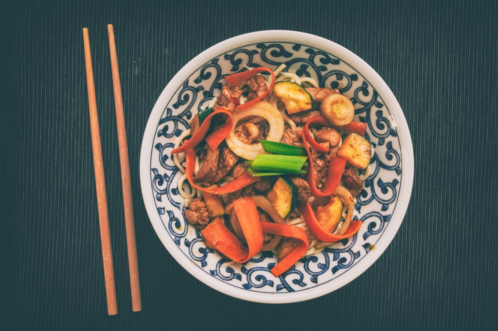 - Do woka dodajemy marchewkę i cukinę i smażymy stir-fry, aż będą kruche (2-3 minuty), dodajemy podsmażoną wołowinę, marynatę oraz ugotowane noodles. Smażymy 3 minuty, podajemy natychmiast.
