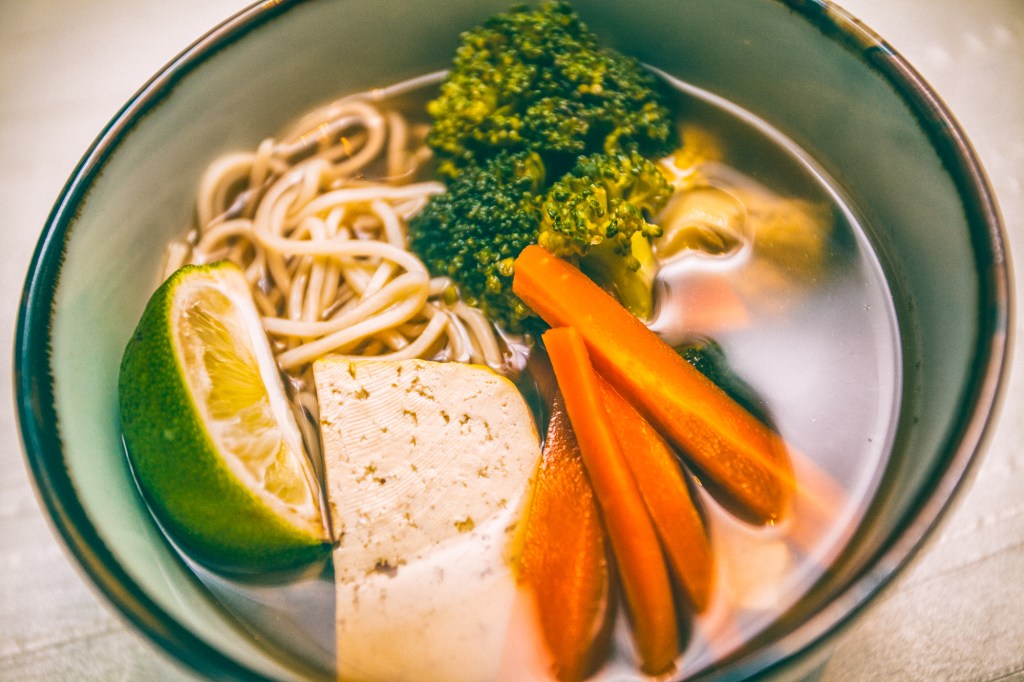- Do garnka z bulionem dodać warzywa (marchewka, różyczki brokuła, rzepę) oraz tofu – całość gotować przez 5 minut na mocnym ogniu.
