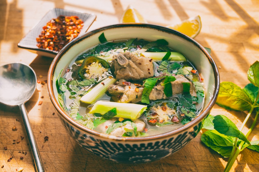 - Do garnka z powrotem dać żeberka oraz cebulę i zieloną tajską papryczkę – gotować przez 5 minut. Doprawić sokiem z limonki i sosem rybnym do smaku, zdjąć z ognia.