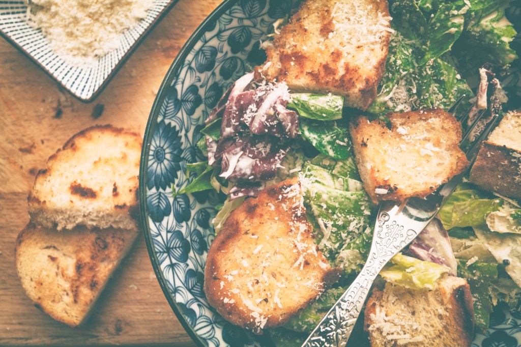 - W misce wymieszać sałatę ze sosem, dodać grzanki i posypać parmezanem.