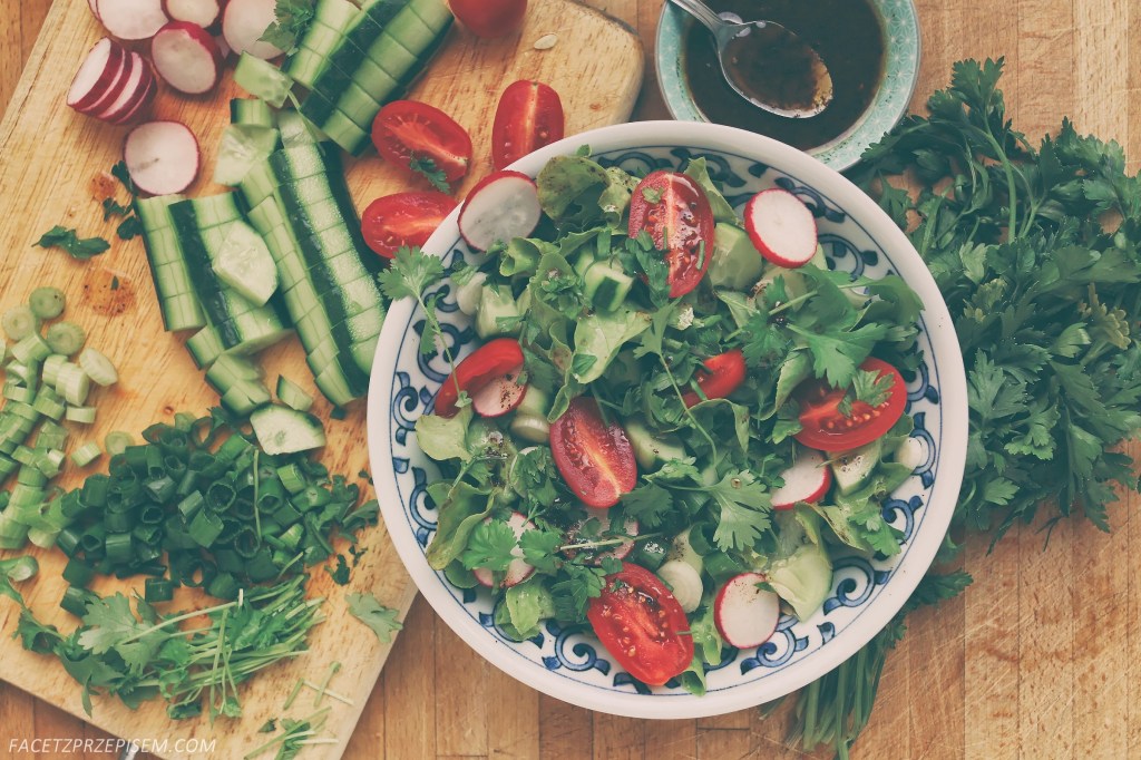 - W dużej misce mieszamy składniki sałatki, w małej miseczce łączymy dokładnie wszystkie składniki sosu.
