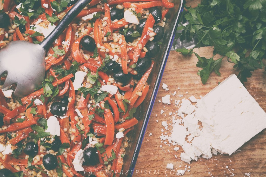 - Marchewkę wyciągnąć z piekarnika, przełożyć do miski, wymieszać z kaszą, oliwkami, pokruszonym serem feta oraz pietruszką. Skropić octem balsamicznym, doprawić do smaku solą i pieprzem.
