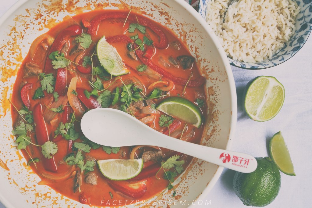 - Dodaję paprykę i cebulę, smażę 4 minuty, dodaje wołowinę i smażę przez kolejne 3 minuty. Doprawiam sokiem z cytryny, zdejmuję z ognia. Dekoruję limonką oraz kolendrą, podaję z ryżem.