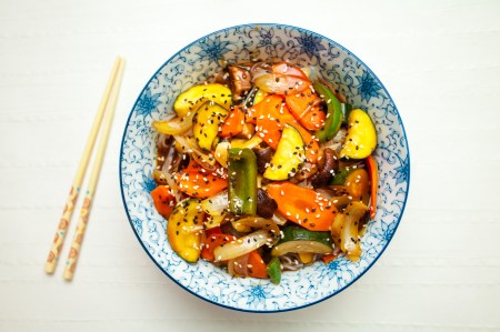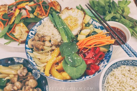 Bibimbap to obok kimchi i bulgogi jedno z najbardziej popularnych dań z Korei. W klasycznym przepisie, podstawowym składnikiem jest mielona wołowina, dziś podaję przepis na wersję wegetariańską. Składniki bibimbap można dowolnie zmieniać.